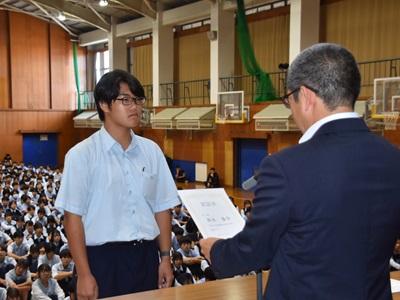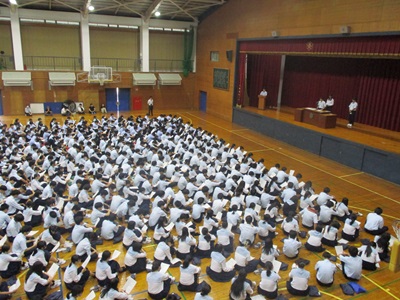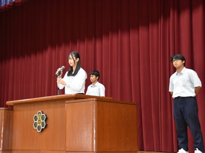10月8日(水)に後期生徒会認証式が執り行われました。今年度の前期生徒会から引き続き、また新たに加わったメンバーとともに、後期の活動が本格的にスタートしました。認証式では、前期生徒会長の言葉を受け、後期生徒会長が代表して、これからの半年間へ向けての決意を新たにしました。