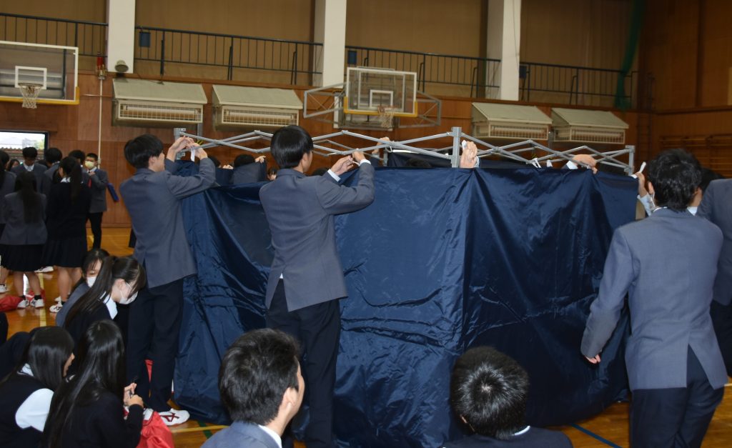 11月13日(木)に北名古屋市危機管理課より、講師の方にご来校いただき、1年生を対象に、防災講話を実施しました。災害についての講義や防災用品の紹介、避難所で使用する資機材(段ボールベッド、簡易間仕切り、避難ルームテント)の組み立て体験をしました。組み立て体験については、実際に避難所で使用する資機材をお借りして、各クラスの防災委員の生徒がクラス講師として説明をし、協力して組み立てることができました。体験後には「意外と簡単だった」「体験できてよかった」との声もあり、充実した講話となりました。