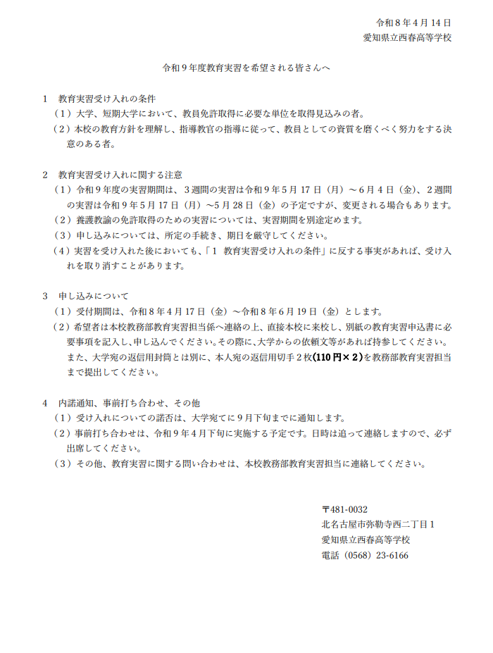 来年度(令和9年度)の教育実習について、